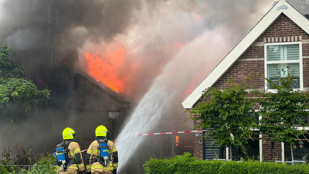 In de schuur staan oldtimers en motoren opgeslagen. De brandweer is met veel wagens op de brand afgekomen en de straat is afgezet.