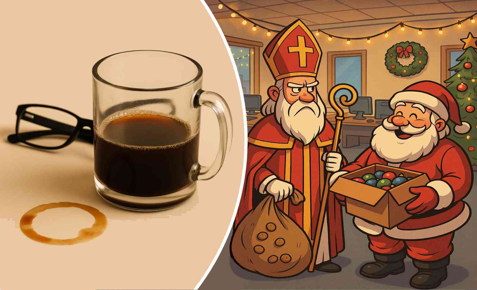 “Ze hangen al kerstlichtjes op terwijl ik nog maar net ben aangekomen”, moppert de Sint. De Kerstman grinnikt. “Rustig, Nick. Jij begint december, ik sluit ’m af. Teamwork!” “Teamwork?” bromt de Sint. “Ik voel me meer het voorprogramma.”