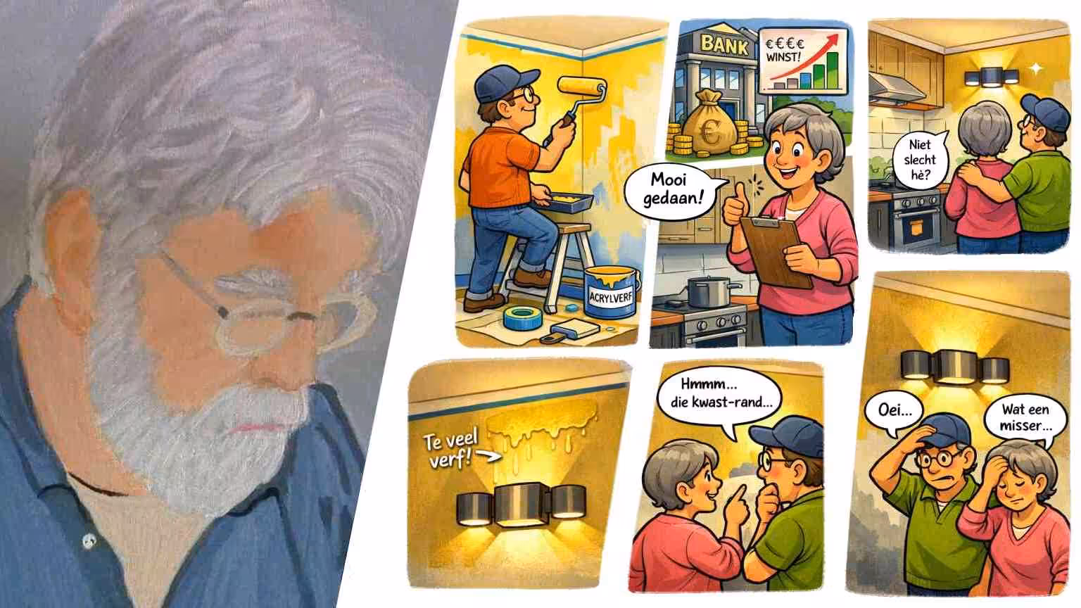 Mevrouw Grosthuizen en ik kregen wel tegelijkertijd het idee om het overschilderen van de pas gestucte keukenmuur zelf ter hand te nemen, zodat de kosten van een nieuwe keuken iets minder uit de hand zouden lopen.