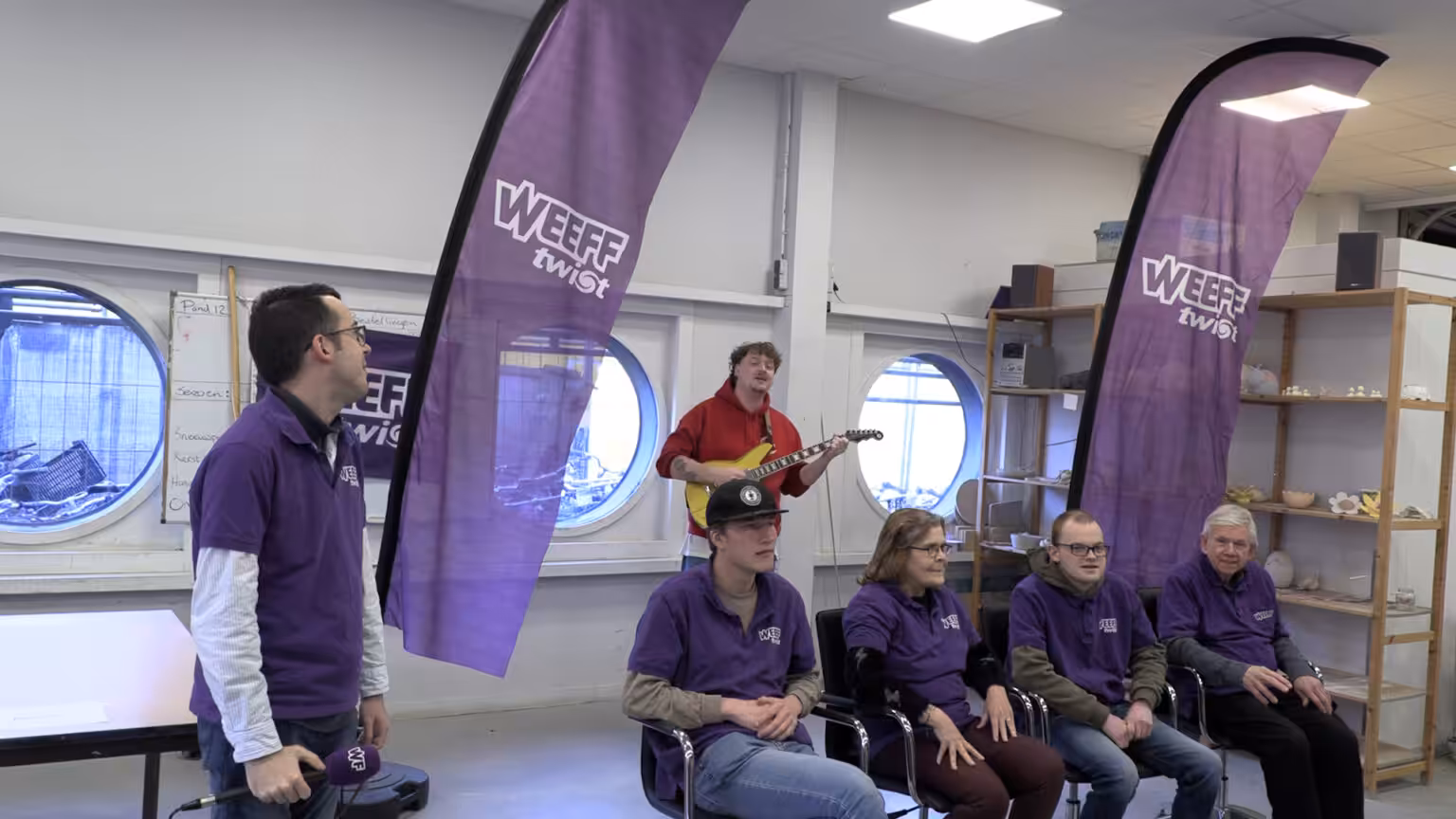 Als inspiratie hebben de radiomakers van WEEFF Twist eenzelfde opstelling gemaakt als de jury van het talentenprogramma. Met bureaustoelen, en de namen van de juryleden op de achterkant, mocht Daan opnieuw auditie doen. Met het nummer ‘Black’ van Pearl Jam zorgde hij ook hier snel voor draaiende stoelen.