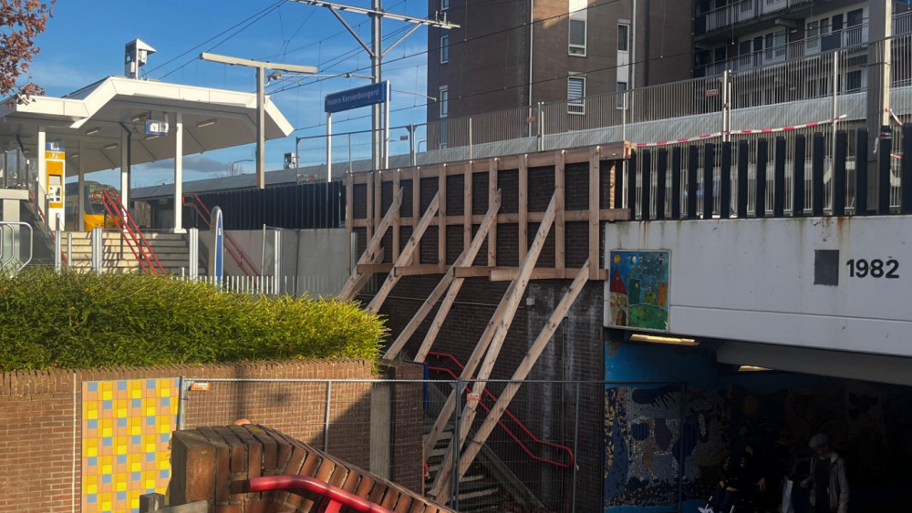 Afgelopen zomer werd de stationstrap afgesloten, omdat er bij de muur sprake was van instortingsgevaar. De muur wordt sindsdien gestut door houten balken. Voor reizigers betekent dit dat ze moeten omlopen. De trap biedt de kortste route om van perron te wisselen en zorgt ervoor dat mensen die onder de tunnel doorgaan nu steeds moeten omlopen om op het platform te komen.