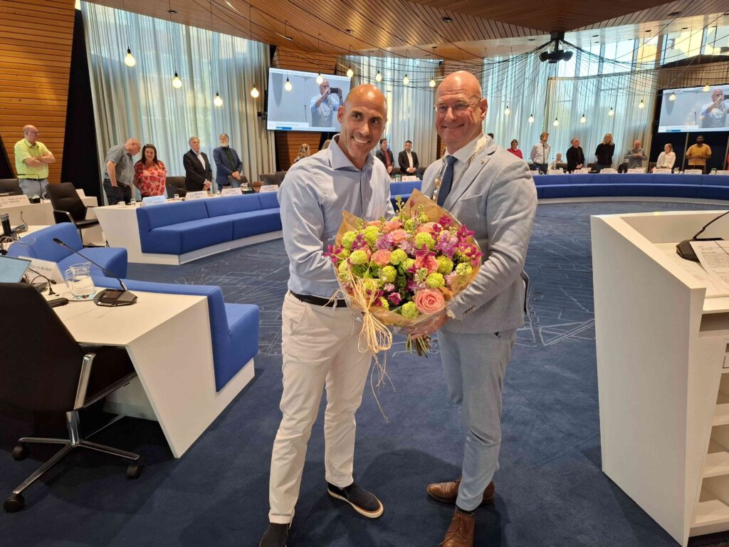 Burgemeester Jan Nieuwenburg neemt hen de gelofte en eed af en met een mooie bos bloemen wordt de ceremonie afgesloten.