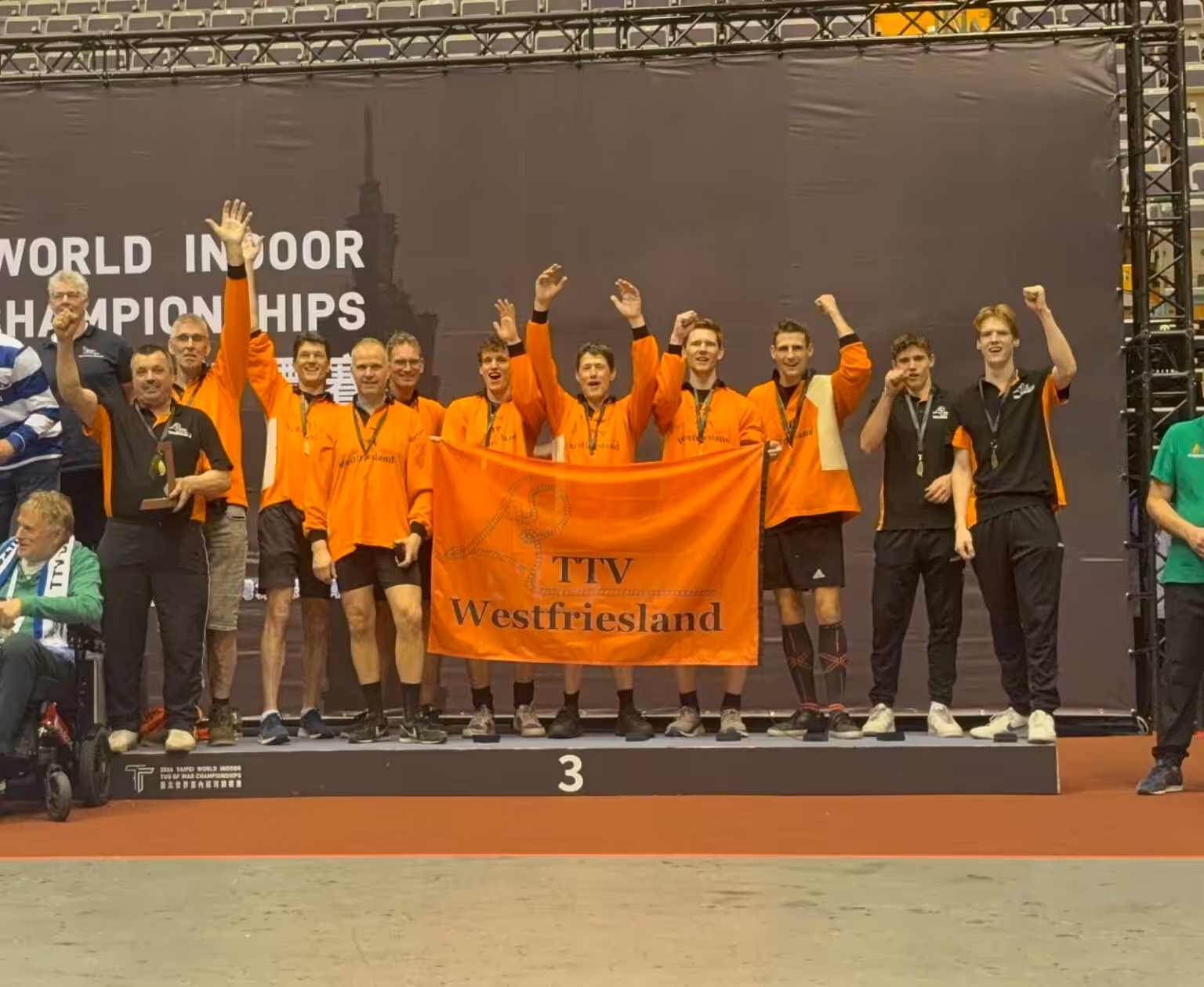 De touwtrekkers van TTV Westfriesland uit Nibbixwoud hebben op het WK ‘Tug of War’ in Taiwan een bronzen medaille gewonnen. In de klasse tot 640 kilo waarvoor de sporters flink om hun gewicht moesten denken, ging het eremetaal volgens ankerman Dennis Bijl relatief makkelijk naar zijn ploeg. Zondagnacht komt het team nogmaals in actie namens Nederland. “We hopen dat mensen dan met een biertje in de kroeg ons zullen aanmoedigen.”