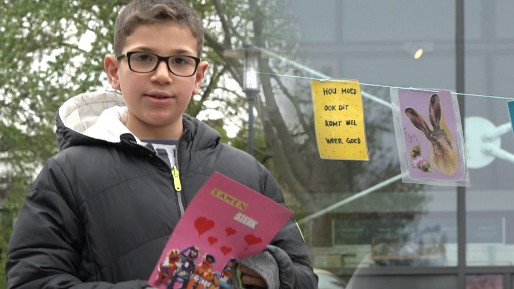 Aan de slinger hangen vlaggen met een boodschap of tekening van mensen uit de wijk. Daar deden zo’n tweehonderd mensen aan mee, van jong tot oud. Wie langsloopt leest woorden als: ‘Hou moed, ook dit komt wel weer goed’, ‘stay strong’ en ‘blijf positief’.