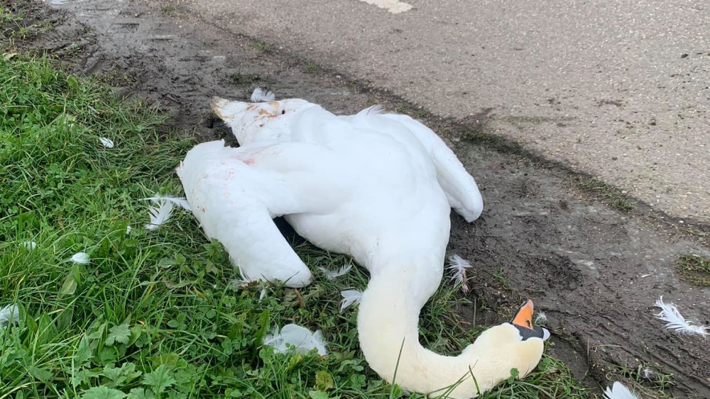 De zwaan werd rond het middaguur overreden door de tractor. Zoals op de foto te zien, ligt de watervogel niet op het pad, maar in de berm. “Iemand uit de buurt heeft het zien gebeuren”, vertelt bewoonster Edith Hartog, die aan de weg woont op de Rikkert. “De tractor is expres uitgeweken om over de zwaan heen te rijden.” De bewoonster werd gevraagd of ze de dierenambulance en de politie kon bellen.
